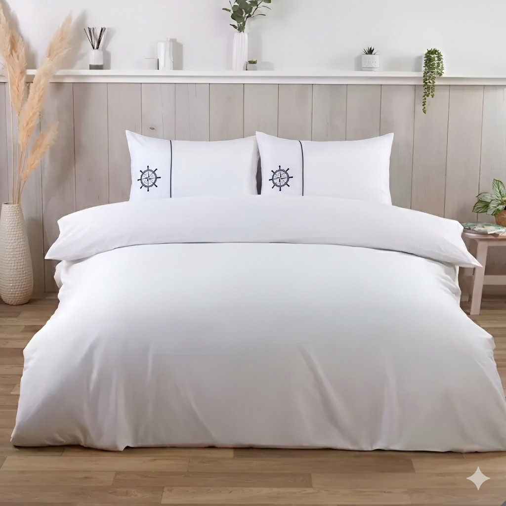 Ez a hófehér ágynemű kifinomult, mélykék kormánykerék mintás hímzésével és az elegánsan bevarrt kék díszzsinór részleteivel a hajózás időtlen világát idézi.